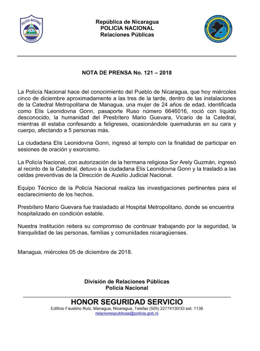 La Policía Nacional informó que este miércoles cinco de diciembre aproximadamente a las tres de la tarde, dentro de las instalaciones de la Catedral Metropolitana de Managua, una mujer de 24 años de edad, identificada como Elis Leonidovna Gonn, pasaporte ruso, número 6646016, roció con líquido desconocido, la humanidad del Presbítero Mario Guevara, Vicario de la Catedral, mientras él estaba confesando a feligreses, ocasionándole quemaduras en su cara y cuerpo, afectando a 5 personas más.