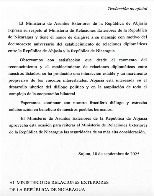 ABJASIA / El Ministerio de Asuntos Exteriores de Abjasia saludó este 10 de septiembre a Nicaragua en ocasión del 16º aniversario del establecimiento de relaciones diplomáticas entre ambos países, destacando el fortalecimiento de los lazos bilaterales y el compromiso de seguir ampliando la cooperación política y diplomática.