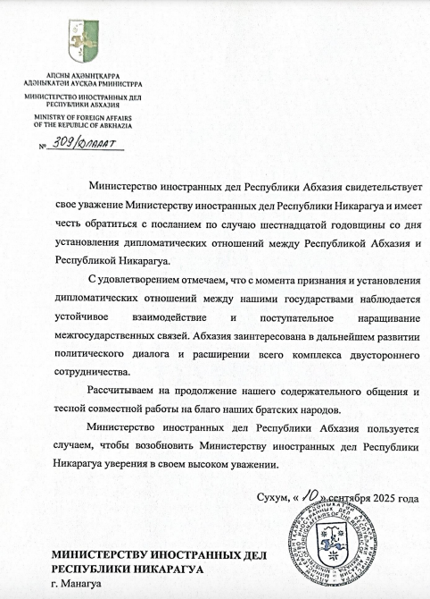 El Ministerio de Asuntos Exteriores de la República de Abjasia expresa su respeto al Ministerio de Relaciones Exteriores de la República de Nicaragua y tiene el honor de dirigirse a su mensaje con motivo del decimoscxto aniversario del establecimiento de relaciones diplomáticas entre la República de Abjasia y la República de Nicaragua.