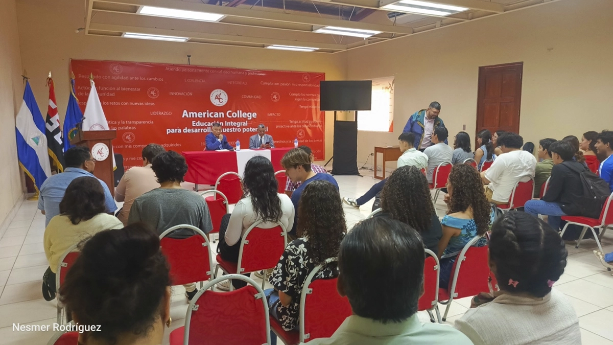 MANAGUA – NICARAGUA / La comunidad estudiantil de la Universidad American College (UAC) participó en una conferencia para conocer la gesta heroica de Octubre Victorioso, un acontecimiento histórico clave que marcó el camino hacia el triunfo definitivo de la Revolución Popular Sandinista contra la Dictadura Somocista.