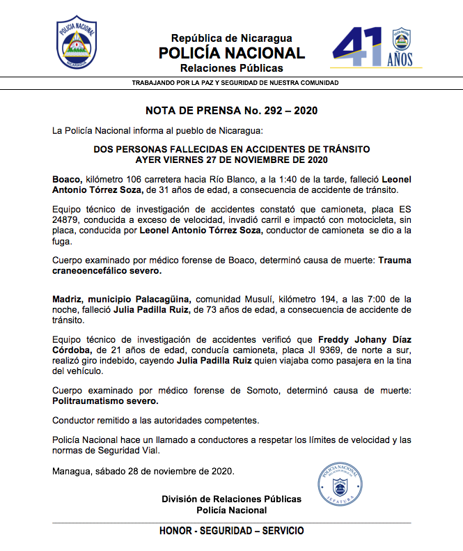 A través de una nota de prensa, la Policía Nacional informó sobre dos diferentes accidentes de tránsito, entre ellos uno ocurrido en Boaco en el que falleció el motociclista Leonel Antonio Tórrez Soza de 31 años de edad.