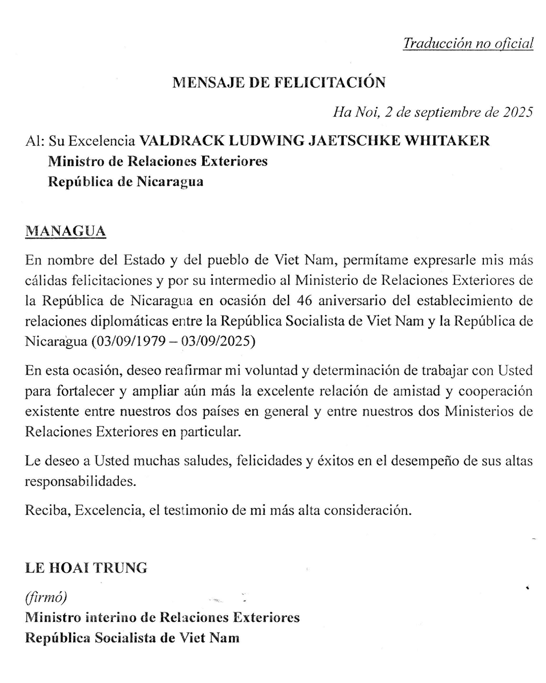 En nombre del Estado y del pueblo de Viet Nam, permítame expresarle mis más cálidas felicitaciones y por su intermedio al Ministerio de Relaciones Exteriores de la República de Nicaragua en ocasión del 46 aniversario del establecimiento de relaciones diplomáticas entre la República Socialista de Viet Nam y la República de Nicaragua (03/09/1979 – 03/09/2025).