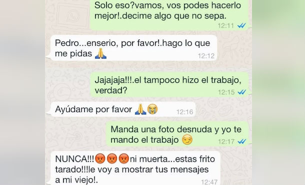 Este chavalo sostuvo una conversación con una joven que estaba buscando como resolver la tarea que le habían asignado en clases, Pedro en forma de chantaje le dijo, le pasaba la tarea si ella le enviaba una fotografía desnuda.