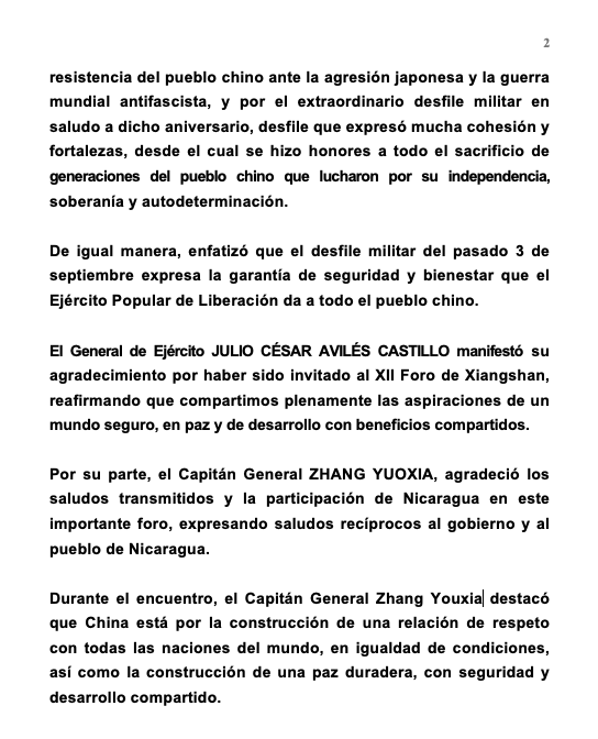 Durante el encuentro, el General de Ejército JULIO CÉSAR AVILES CASTILLO, transmitió el saludo del Comandante Daniel Ortega y la Compañera Rosario Murillo, Co-Presidentes de la República de Nicaragua y Jefatura Suprema del Ejército de Nicaragua, al Presidente Xi JinPing, al pueblo chino y a las máximas autoridades militares del Ejército Popular de Liberación. De igual manera, transmitió el saludo de todos los integrantes del Ejército de Nicaragua.