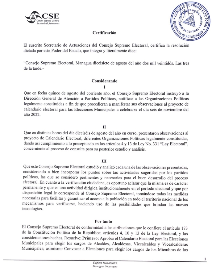 Por tanto, de conformidad a las atribuciones que le confiere el Artículo 173 de la Constitución Política de la República; Artículos 4, 10 y 13 de la Ley Electoral, Ley 331, resuelve La aprobación del Calendario Electoral de las Elecciones Municipales 2022 para elegir los cargos de Alcaldes, Alcaldesas, Vicealcaldes y Vicealcaldesas Municipales; así mismo, para elegir los cargos de los Miembros de los Concejos Municipales, propietarios y propietarias, con sus respectivas o respectivos suplentes, por Circunscripción Municipal, en los 153 municipios de Nicaragua. Este documento, publicado en La Gaceta, Diario Oficial de la República de Nicaragua, establece el desarrollo de las actividades del proceso electoral de las Elecciones Municipales de 2022, según lo establecido en el Artículo 04 de la Ley 331, Ley Electoral, que expresa que “el Consejo Supremo Electoral, elaborará, en consulta con las organizaciones políticas que gozan de personalidad jurídica, un Calendario Electoral, con la debida antelación, para cada elección, señalando, entre otras actividades: el término, desarrollo, procedimiento de la Campaña Electoral y el día de las votaciones”.