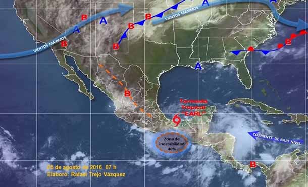 Earl se encuentra ubicado en la latitud 18.5 grados norte y longitud 93.5 grados oeste y se espera que experimente un giro hacia el oeste con pérdida de intensidad el sábado, a medida que se desplaza por tierra.