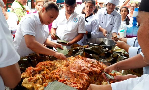 Protagonistas del Técnico General en Cocina y Gastronomía del Centro Tecnológico Monseñor Benedicto Herrera, prepararon el Nacatamal más grande, para exponerlo y repartirlo entre la población asistente a la Feria Nacional del Maíz en Matagalpa.