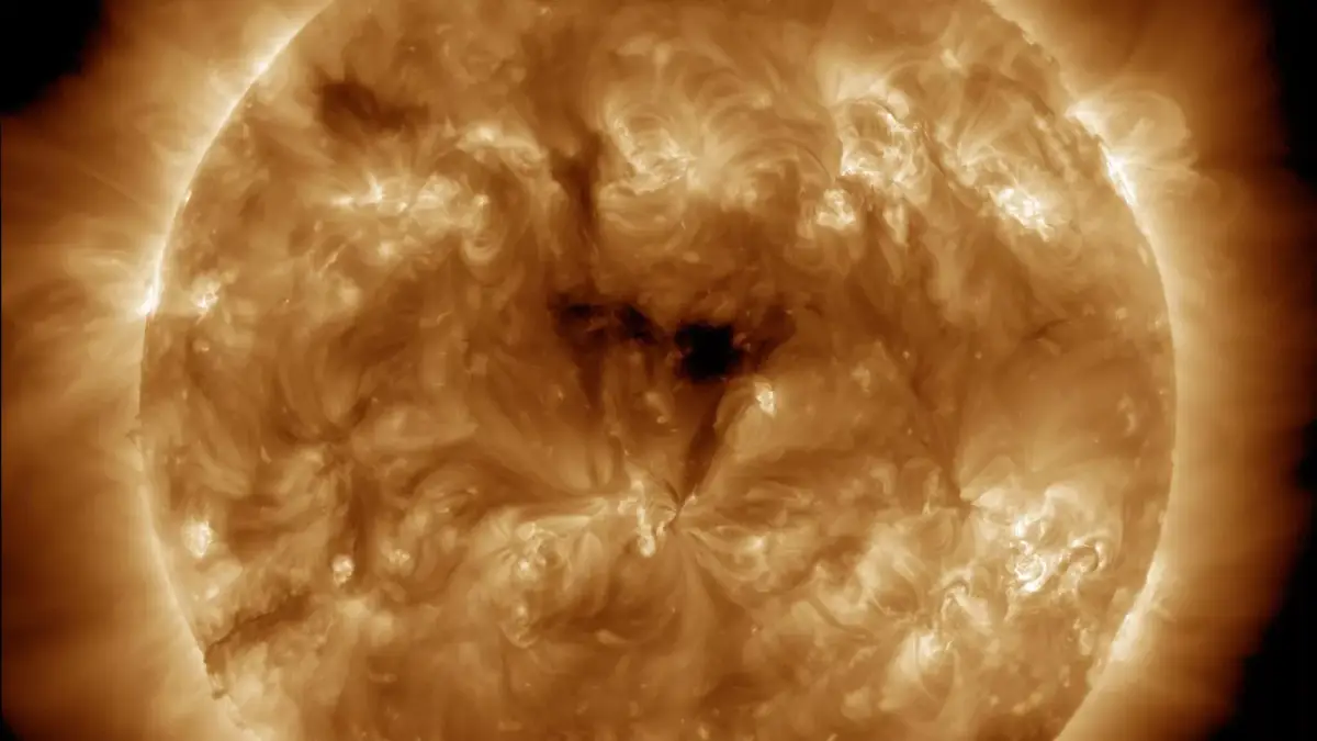 El Sol está formado por plasma que se mueve desde el interior hacia su superficie, creando campos magnéticos que se inflan, chocan y se fusionan. La NASA explicó que un agujero coronal aparece cuando esos campos salen disparados hacia el espacio. Así, los vientos solares, que son trozos de plasma del Sol, escapan al espacio a gran velocidad.
