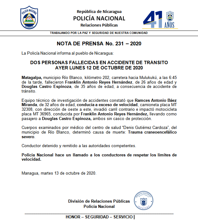 La Policía Nacional informó este martes a través de una nota de prensa, sobre el fallecimiento de un motociclista y su acompañante, al ser atropellados por el conductor de una camioneta en Matagalpa, municipio Río Blanco, kilómetro 202, carretera hacia Mulukukú.