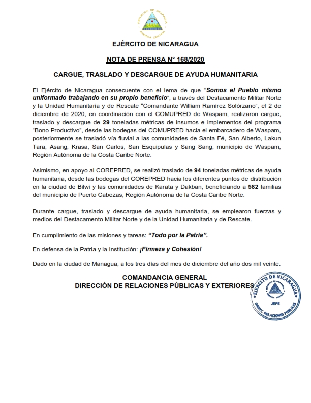 El Ejército de Nicaragua consecuente con el lema de que “Somos el Pueblo mismo uniformado trabajando en su propio beneficio”, a través del Destacamento Militar Norte y la Unidad Humanitaria y de Rescate “Comandante William Ramírez Solórzano”, el 2 de diciembre de 2020, en coordinación con el COMUPRED de Waspam, realizaron cargue, traslado y descargue de 29 toneladas métricas de insumos e implementos del programa “Bono Productivo”, desde las bodegas del COMUPRED hacia el embarcadero de Waspam, posteriormente se trasladó vía fluvial a las comunidades de Santa Fé, San Alberto, Lakun Tara, Asang, Krasa, San Carlos, San Esquipulas y Sang Sang, municipio de Waspam, Región Autónoma de la Costa Caribe Norte.