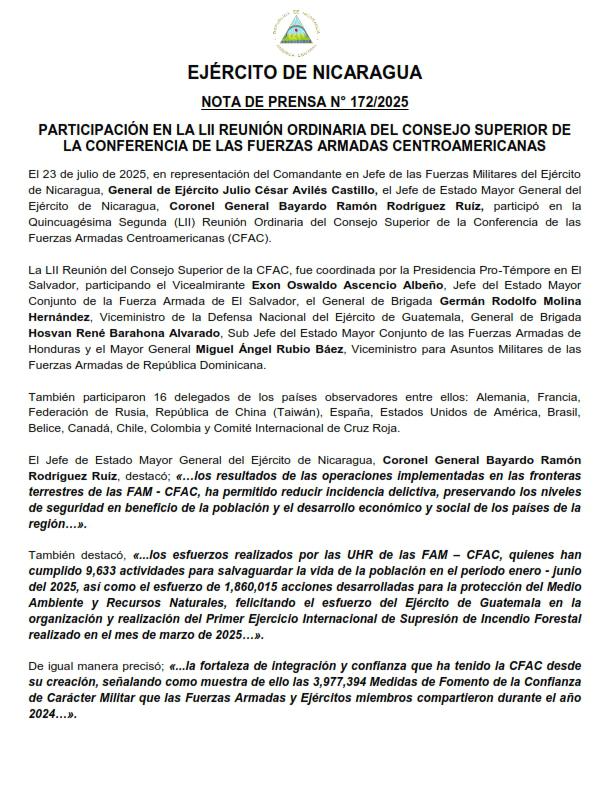 El 23 de julio de 2025, en representación del Comandante en Jefe de las Fuerzas Militares del Ejército de Nicaragua, General de Ejército Julio César Avilés Castillo, el Jefe de Estado Mayor General del Ejército de Nicaragua, Coronel General Bayardo Ramón Rodríguez Ruíz, participó en la Quincuagésima Segunda (LII) Reunión Ordinaria del Consejo Superior de la Conferencia de las Fuerzas Armadas Centroamericanas (CFAC).