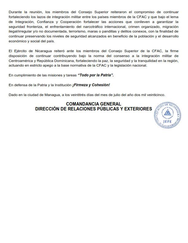 El Ejército de Nicaragua reiteró ante los miembros del Consejo Superior de la CFAC, la firme disposición de continuar contribuyendo bajo la norma del consenso a la integración militar de Centroamérica y República Dominicana, fortaleciendo la paz, la seguridad y la tranquilidad en la región, actuando en estricto apego a la base normativa de la CFAC y la legislación nacional.