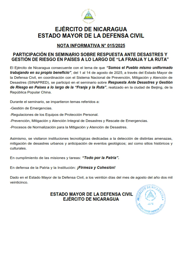 El Ejército de Nicaragua consecuente con el lema de que “Somos el Pueblo mismo uniformado trabajando en su propio beneficio”, del 1 al 14 de agosto de 2025, a través del Estado Mayor de la Defensa Civil, en coordinación con el Sistema Nacional de Prevención, Mitigación y Atención de Desastres (SINAPRED), se participó en el seminario sobre Respuesta Ante Desastres y Gestión de Riesgo en Países a lo largo de la “Franja y la Ruta”, realizado en la ciudad de Beijing, de la República Popular China.