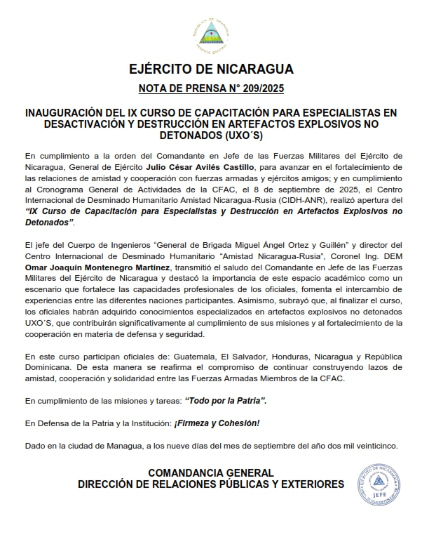 En cumplimiento a la orden del Comandante en Jefe de las Fuerzas Militares del Ejército de Nicaragua, General de Ejército Julio César Avilés Castillo, para avanzar en el fortalecimiento de las relaciones de amistad y cooperación con fuerzas armadas y ejércitos amigos; y en cumplimiento al Cronograma General de Actividades de la CFAC, el 8 de septiembre de 2025, el Centro Internacional de Desminado Humanitario Amistad Nicaragua-Rusia (CIDH-ANR), realizó apertura del “IX Curso de Capacitación para Especialistas y Destrucción en Artefactos Explosivos no Detonados”.