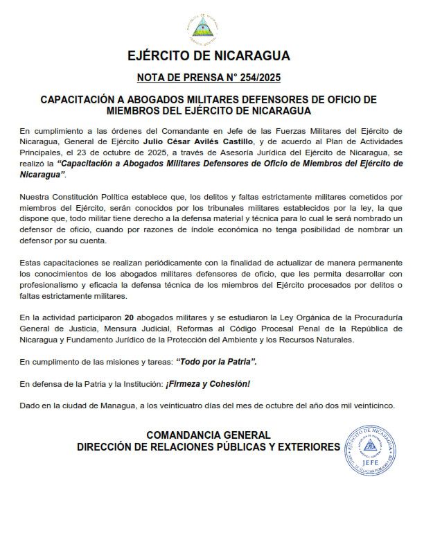 En cumplimiento a las órdenes del Comandante en Jefe de las Fuerzas Militares del Ejército de Nicaragua, General de Ejército Julio César Avilés Castillo, y de acuerdo al Plan de Actividades Principales, el 23 de octubre de 2025, a través de Asesoría Jurídica del Ejército de Nicaragua, se realizó la “Capacitación a Abogados Militares Defensores de Oficio de Miembros del Ejército de Nicaragua”.