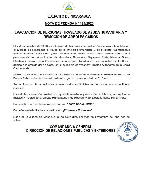 El 7 de noviembre de 2020, en el marco de las tareas de protección y apoyo a la población, el Ejército de Nicaragua a través de la Unidad Humanitaria y de Rescate “Comandante William Ramírez Solórzano” y del Destacamento Militar Norte, realizó evacuación de 935 personas de las comunidades de Kiwastara, Rayapura, Ahyapura, Anris, Klampa, Boom, Plankira y Sawa, hacia los centros de albergue ubicados en la comunidad de El Koom, debido a la crecida del río Coco, en el municipio de Waspam, Región Autónoma de la Costa Caribe Norte.