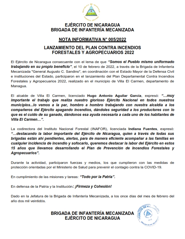 El Ejército de Nicaragua el 10 de febrero de 2022, a través de la Brigada de Infantería Mecanizada «General Augusto C. Sandino», en coordinación con el Estado Mayor de la Defensa Civil e instituciones del Estado, participaron en el lanzamiento del Plan Departamental Contra Incendios Forestales y Agropecuarios 2022, realizado en el municipio de Villa El Carmen, departamento de Managua.