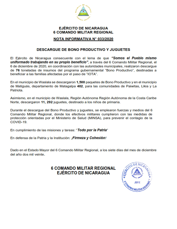 El Ejército de Nicaragua consecuente con el lema de que “Somos el Pueblo mismo uniformado trabajando en su propio beneficio”, a través del 6 Comando Militar Regional, el 6 de diciembre de 2020, en coordinación con las autoridades municipales, realizaron descargue de 76 toneladas de insumos del programa gubernamental “Bono Productivo”, destinadas a beneficiar a las familias afectadas por el paso de “IOTA”.