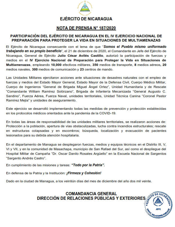 El Ejército de Nicaragua consecuente con el lema de que “Somos el Pueblo mismo uniformado trabajando en su propio beneficio”, el 21 de diciembre de 2020, el Comandante en Jefe del Ejército de Nicaragua, General de Ejército Julio César Avilés Castillo, autorizó la participación de fuerzas y medios en el IV Ejercicio Nacional de Preparación para Proteger la Vida en Situaciones de Multiamenazas, empleando 10,000 efectivos militares, 350 medios de transporte, 8 medios aéreos, 20 medios navales, 300 medios de comunicación y 23 centros de mando.