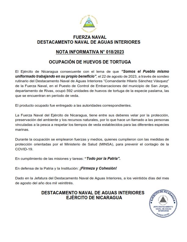 El Ejército de Nicaragua consecuente con el lema de que “Somos el Pueblo mismo uniformado trabajando en su propio beneficio”, el 22 de agosto de 2023, a través de sondeo rutinario del Destacamento Naval de Aguas Interiores “Comandante Hilario Sánchez Vásquez” de la Fuerza Naval, en el Puesto de Control de Embarcaciones del municipio de San Jorge, departamento de Rivas, ocupó 592 unidades de huevos de tortuga de la especie paslama, las que se encuentran en período de veda.
