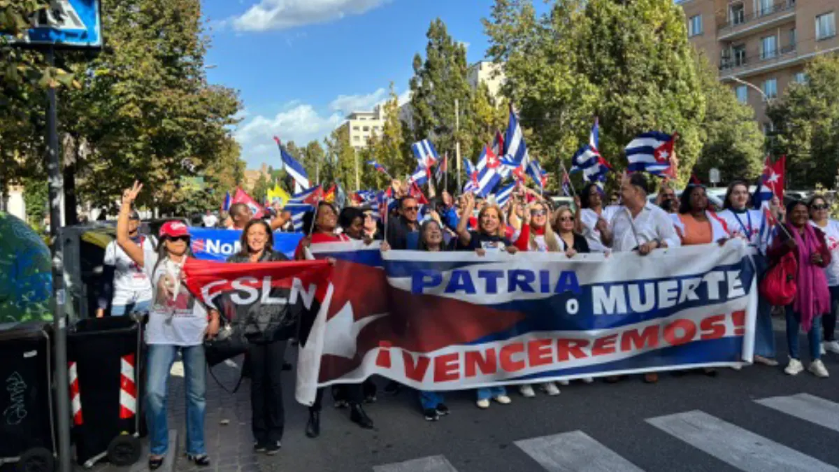 La concentración reunió a cientos de personas que, desde el histórico Monumento a Giuseppe Mazzini, marcharon ondeando pancartas y banderas de diversas fuerzas políticas como Patria Socialista, Refundación Comunista, Poder al Pueblo, el Partido Comunista Italiano y la Oposición Estudiantil de Alternativa (OSA), exigiendo el fin de esta política genocida que afecta al pueblo cubano.
