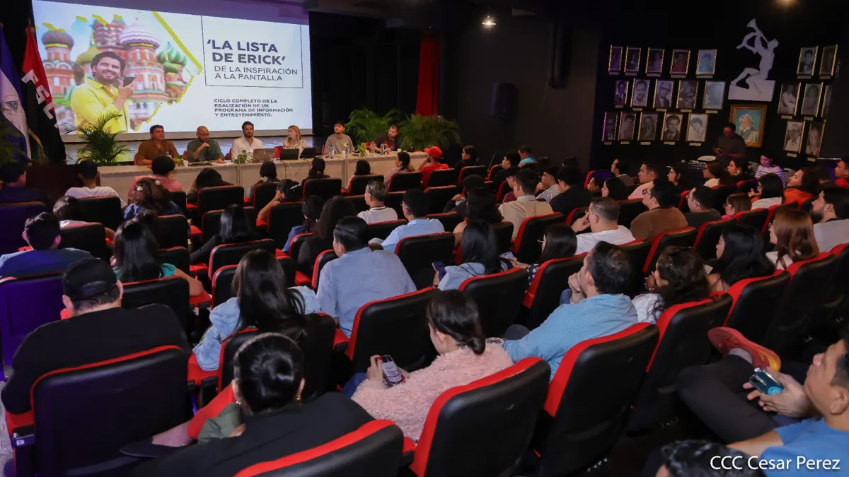 MANAGUA – NICARAGUA / El encuentro de intercambio con el equipo de producción del programa La Lista de Erick reunió en la Cinemateca Nacional a periodistas de los Medios Sandinistas, jóvenes de la Red de Comunicadores y estudiantes de comunicación de las universidades del pueblo, con el objetivo de fortalecer lazos profesionales y avanzar en la elaboración de nuevos programas dedicados a la riqueza del país.