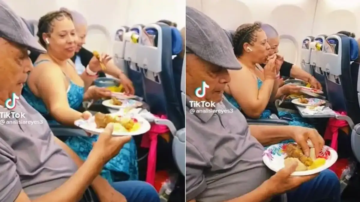 Así se viralizó el video de la usuaria @analisiareyes3 de apenas 5 segundos, el pequeño video muestra a unas personas comiendo piezas de pollo frito, papa y aparentemente yuca en platos desechables con flore, a bordo de un avión.