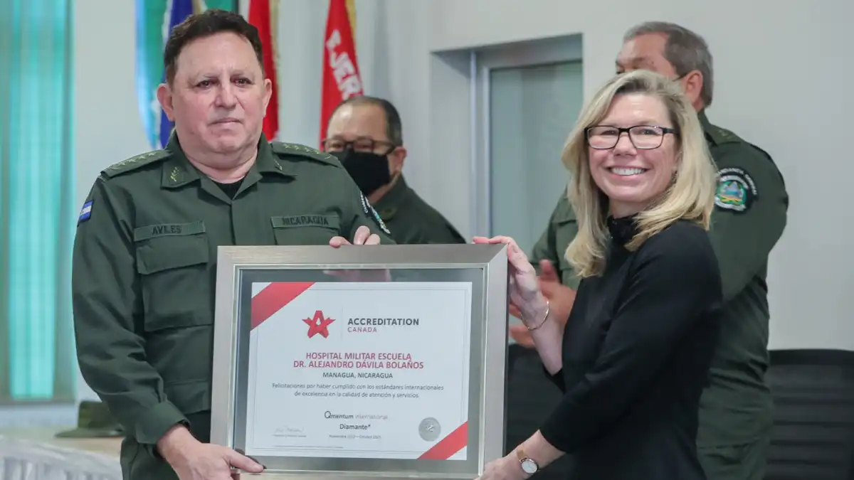 MANAGUA – NICARAGUA / Una vez más el Hospital Militar Escuela Dr. Alejandro Dávila Bolaños, recibió la máxima categoría en nivel Diamante, de la Acreditación Canadá; entidad que evalúa altos estándares internacionales de salud, y que, en el caso del Hospital Militar, es la segunda ocasión en recibir esta categoría por la atención y servicios médicos en el país.