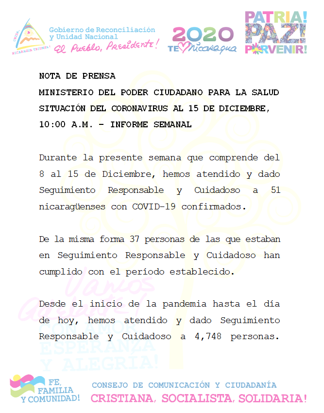 Durante la presente semana que comprende del 8 al 15 de Diciembre, hemos atendido y dado Seguimiento Responsable y Cuidadoso a 51 nicaragüenses con COVID-19 confirmados.