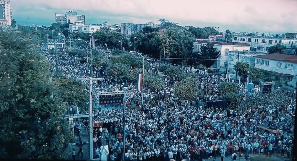 Convocados por la solidaridad, el decoro y la dignidadmás de 50 mil estudiantes, jóvenes, trabajadores e integrantes de las instituciones armadas en representación del pueblo cubano se congregaron ante la estatua ecuestre de Bolívar ubicada en la Avenida de los Presidentes. Desde allí, en haz apretado, recordaron al imperialismo que Venezuela se respeta y que sus bravos hijos, que representan a la América toda, levantarán la espada si el Gigante de las Siete Leguas, ávido de apoderarse del petróleo y otros recursos, osa agredirlos.