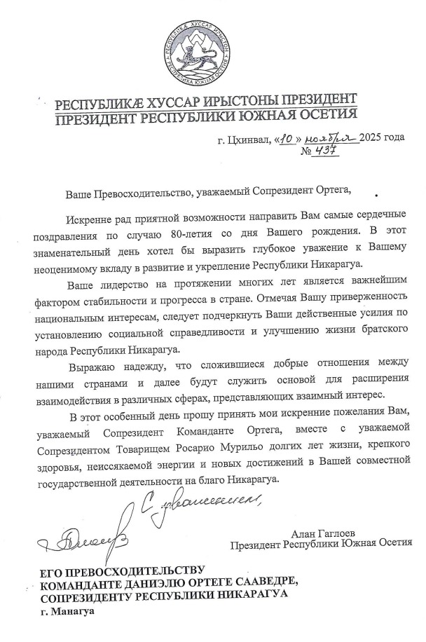 NICARAGUA / El Presidente de la República de Osetia del Sur, Alan Gagloev, envió un cordial mensaje de felicitación al Comandante Daniel Ortega por su cumpleaños.