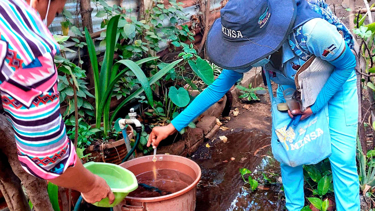 Foto Multinoticias / Brigadista del Ministerio de Salud de Nicaragua aplicando BTI en vivienda del barrio Guardabarranco de Managua