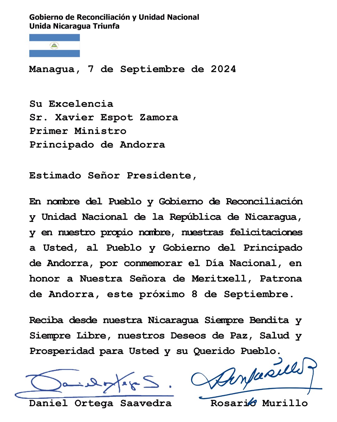 En nombre del Pueblo y Gobierno de Reconciliación y Unidad Nacional de la República de Nicaragua, y en nuestro propio nombre, nuestras felicitaciones a Usted, al Pueblo y Gobierno del Principado de Andorra, por conmemorar el Día Nacional, en honor a Nuestra Señora de Meritxell, Patrona de Andorra, este próximo 8 de Septiembre.