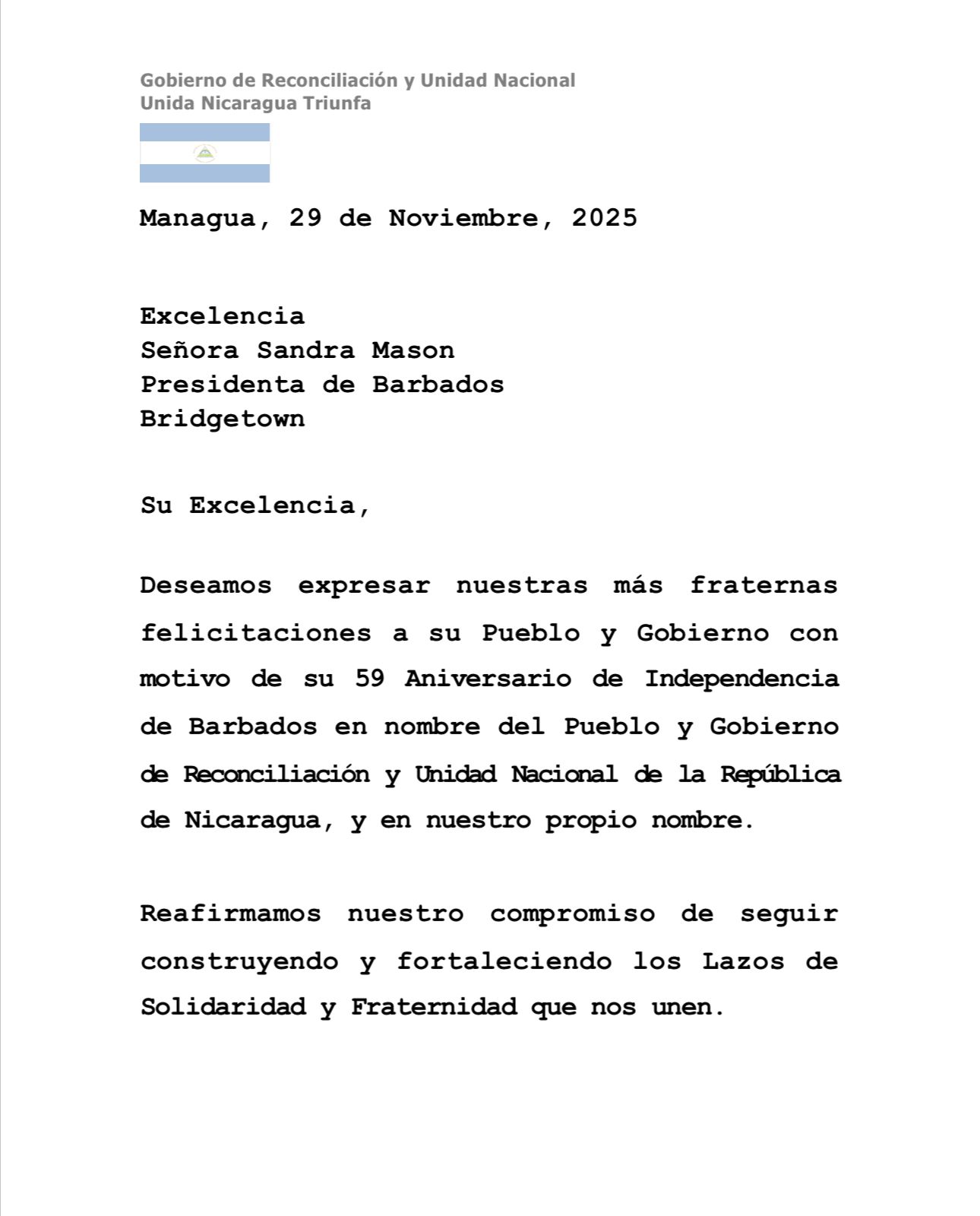MANAGUA – NICARAGUA / Este sábado 29 de noviembre, el Gobierno de Nicaragua envía un mensaje de felicitación al Pueblo y Gobierno de Barbaros por su 59 aniversario de su independencia.
