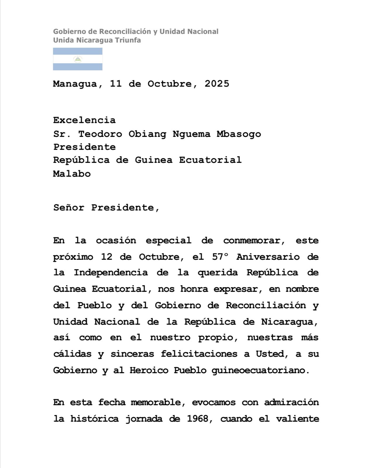 En la ocasión especial de conmemorar, este próximo 12 de Octubre, el 57º Aniversario de la Independencia de la querida República de Guinea Ecuatorial, nos honra expresar, en nombre del Pueblo y del Gobierno de Reconciliación y Unidad Nacional de la República de Nicaragua, así como en el nuestro propio, nuestras más cálidas y sinceras felicitaciones a Usted, a su Gobierno y al Heroico Pueblo guineoecuatoriano.