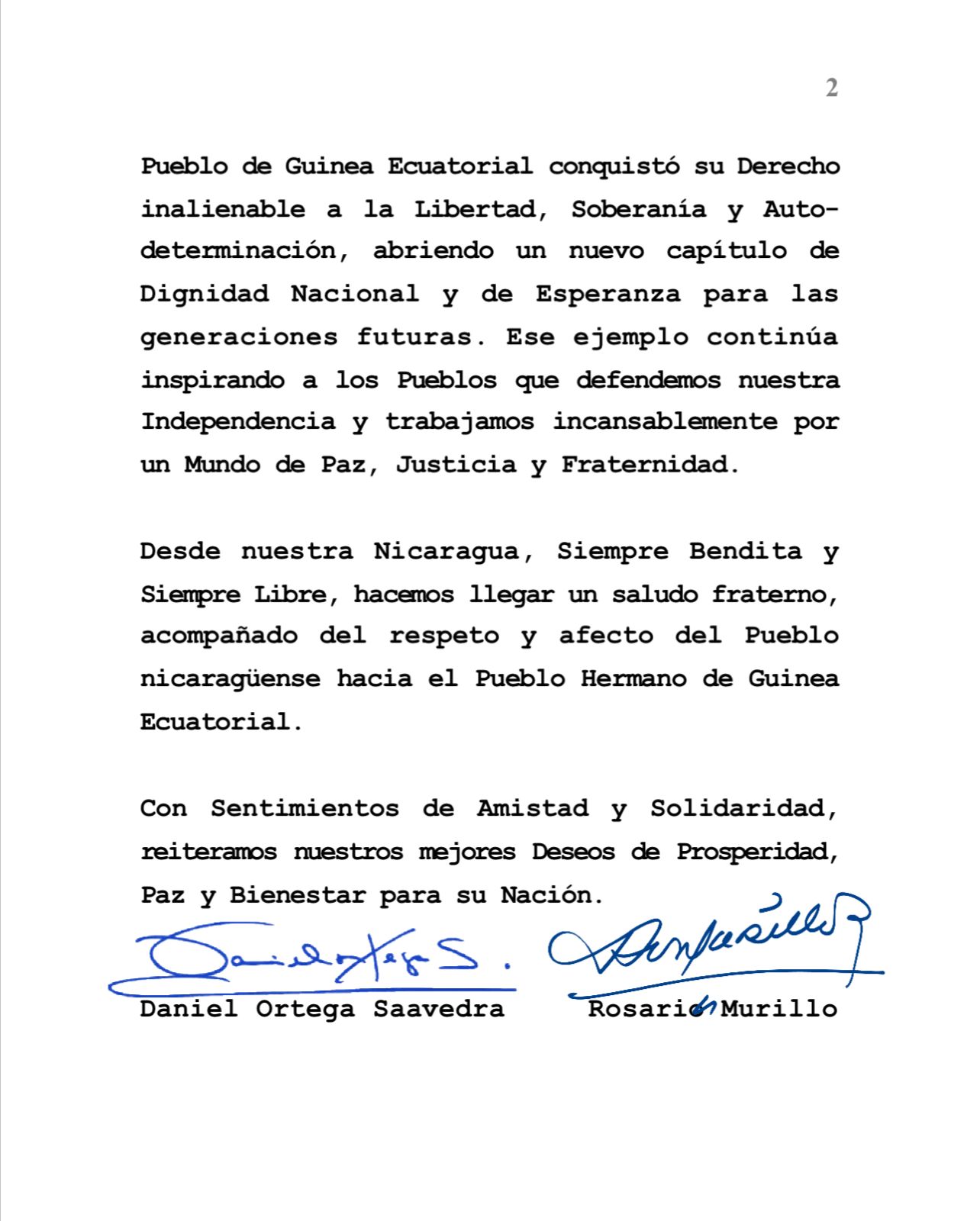 Desde nuestra Nicaragua, Siempre Bendita y Siempre Libre, hacemos llegar un saludo fraterno, acompañado del respeto y afecto del Pueblo nicaragüense hacia el Pueblo Hermano de Guinea Ecuatorial.