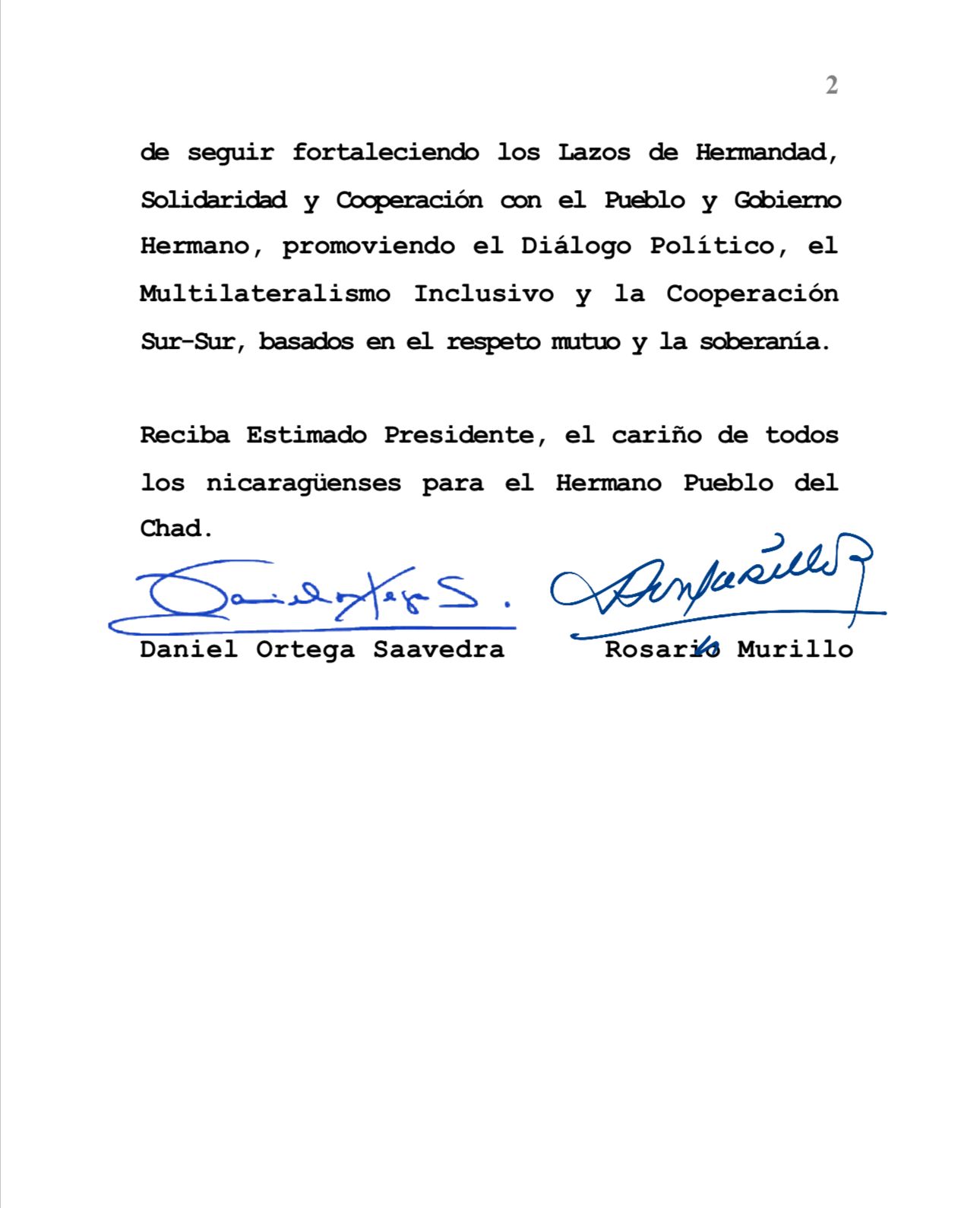 From our Nicaragua, Always Blessed and Always Free, we reaffirm our commitment to continue strengthening the bonds of brotherhood, solidarity, and cooperation with the Brotherly People and Government of Chad, while promoting political dialogue, inclusive multilateralism, and South-South cooperation, based on mutual respect and sovereignty.