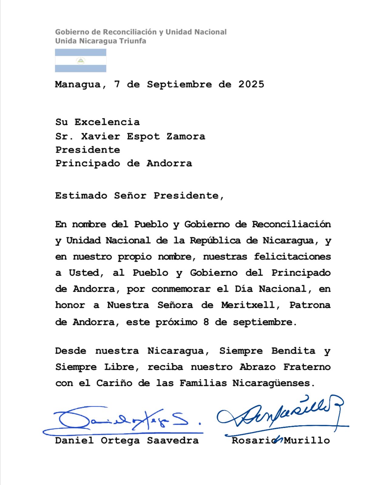En nombre del Pueblo y Gobierno de Reconciliación y Unidad Nacional de la República de Nicaragua, y en nuestro propio nombre, nuestras felicitaciones a Usted, al Pueblo y Gobierno del Principado de Andorra, por conmemorar el Día Nacional, en honor a Nuestra Señora de Meritxell, Patrona de Andorra, este próximo 8 de septiembre.