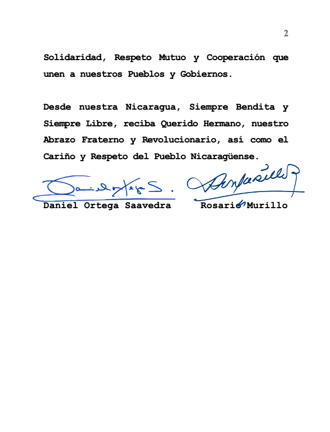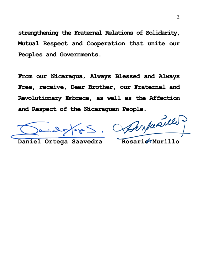 From our Nicaragua, Always Blessed and Always Free, receive, Dear Brother, our Fraternal and Revolutionary Embrace, as well as the Affection and Respect of the Nicaraguan People.