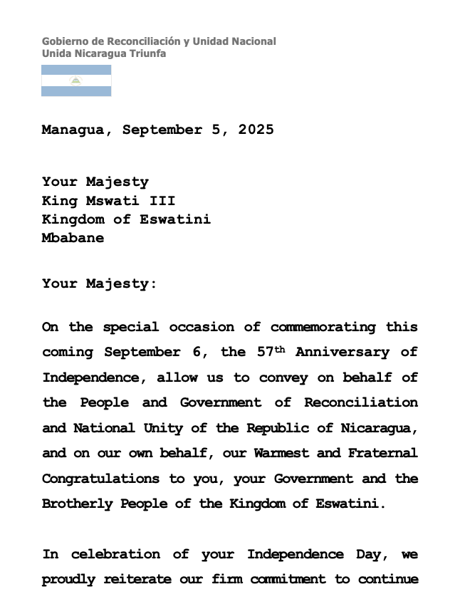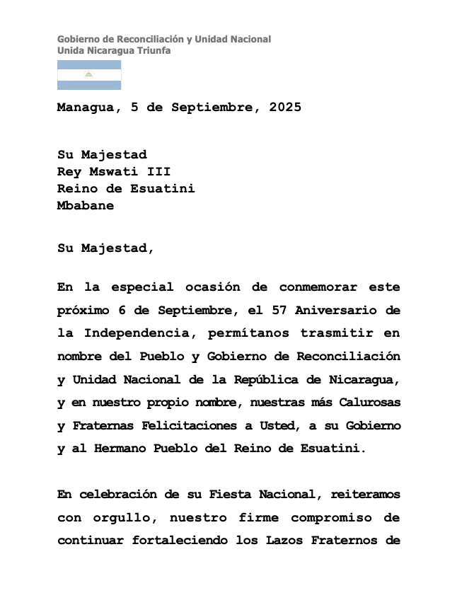 En la especial ocasión de conmemorar este próximo 6 de Septiembre, el 57 Aniversario de la Independencia, permítanos trasmitir en nombre del Pueblo y Gobierno de Reconciliación y Unidad Nacional de la República de Nicaragua, y en nuestro propio nombre, nuestras más Calurosas y Fraternas Felicitaciones a Usted, a su Gobierno y al Hermano Pueblo del Reino de Esuatini.