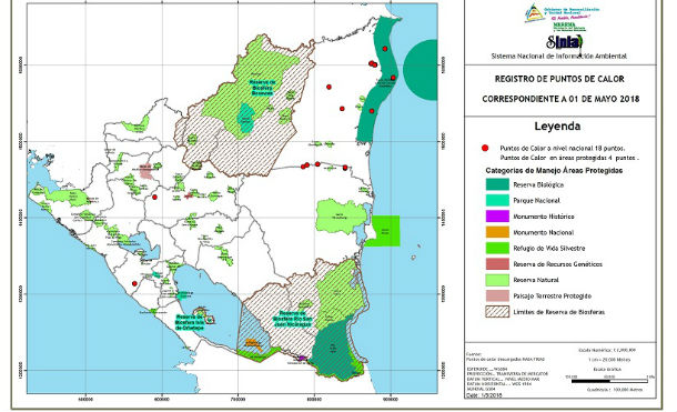 De acuerdo a esto, se localizan en área protegida Cayos Miskitos y Franja Costera Inmediata 4 puntos de calor correspondiente a 22% del total nacional.