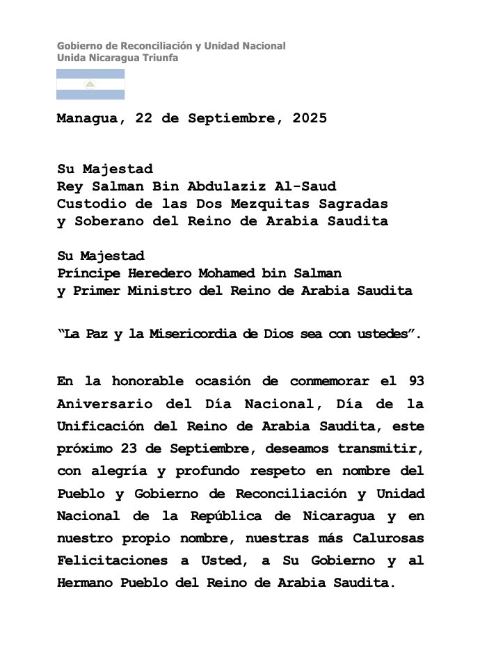 On the honorable occasion of commemorating the 93rd Anniversary of National Day, the Day of the Unification of the Kingdom of Saudi Arabia, this coming September 23, we wish to convey, with joy and deep respect on behalf of the People and Government of Reconciliation and National Unity of the Republic of Nicaragua and on our own behalf, our warmest congratulations to you, your government, and the brotherly people of the Kingdom of Saudi Arabia.