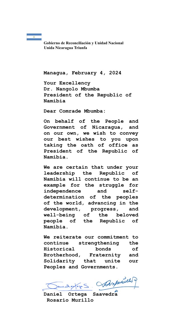 MANAGUA – NICARAGUA / Este domingo 4 de febrero el Gobierno de Nicaragua saludó y transmitió los mejores deseos de éxito al Dr. Nangolo Mbumba, al tomar Juramento como Presidente de la República de Namibia.