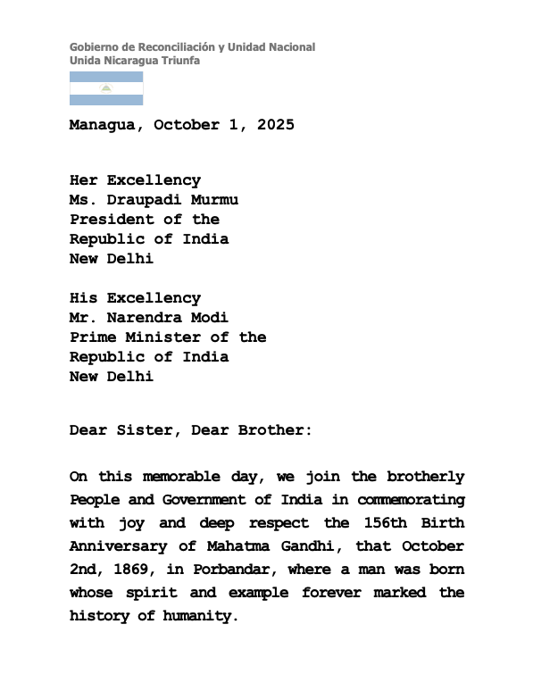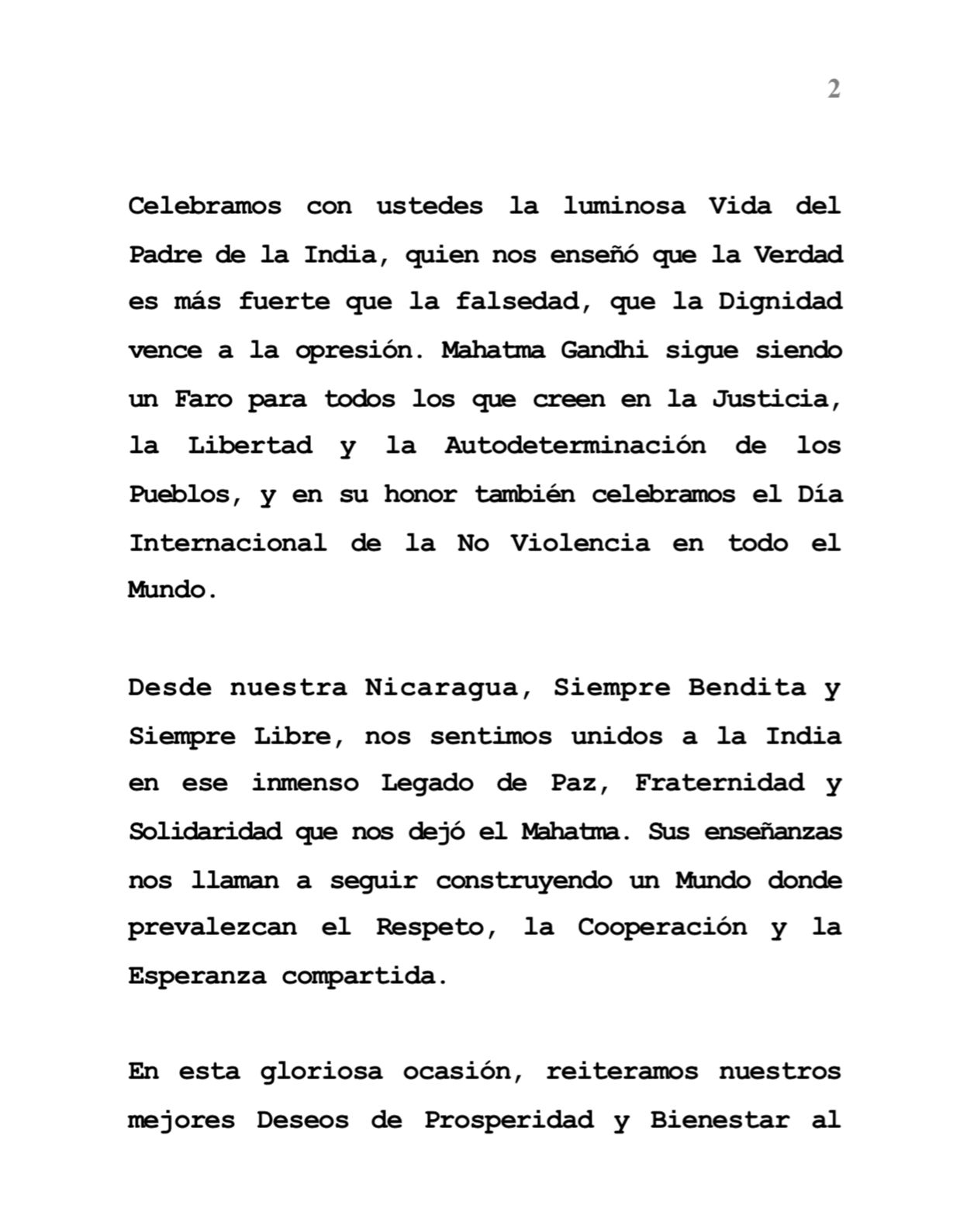 Desde nuestra Nicaragua, Siempre Bendita y Siempre Libre, nos sentimos unidos a la India en ese inmenso Legado de Paz, Fraternidad y Solidaridad que nos dejó el Mahatma. Sus enseñanzas nos llaman a seguir construyendo un Mundo donde prevalezcan el Respeto, la Cooperación y la Esperanza compartida.