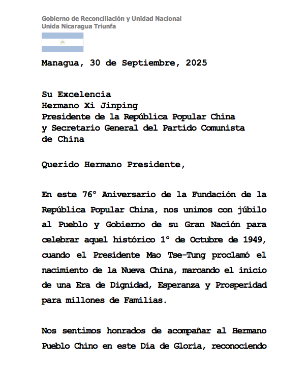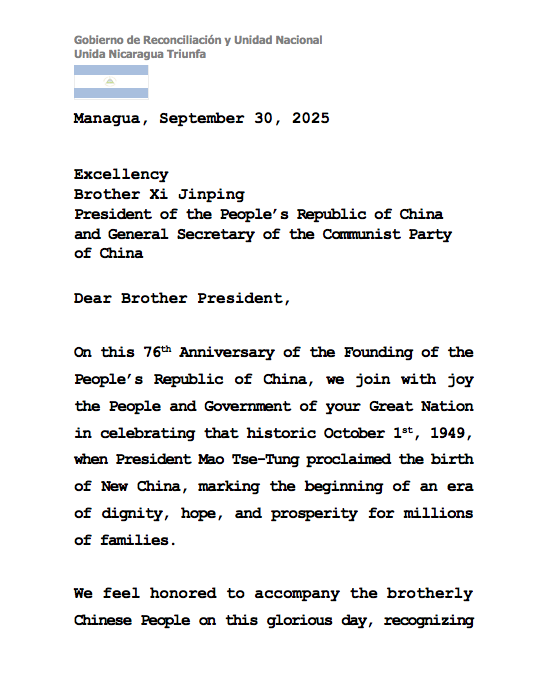 MANAGUA – NICARAGUA / Este martes 30 de septiembre de 2025, el Gobierno de Nicaragua expresó su saludo fraterno a la hermana República Popular China con motivo del 76 aniversario de su fundación que se celebrará este miércoles 1 de octubre.