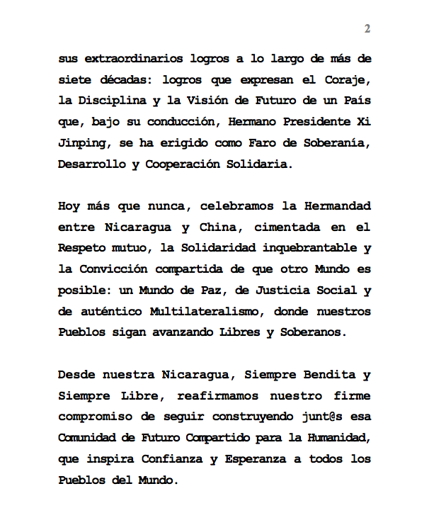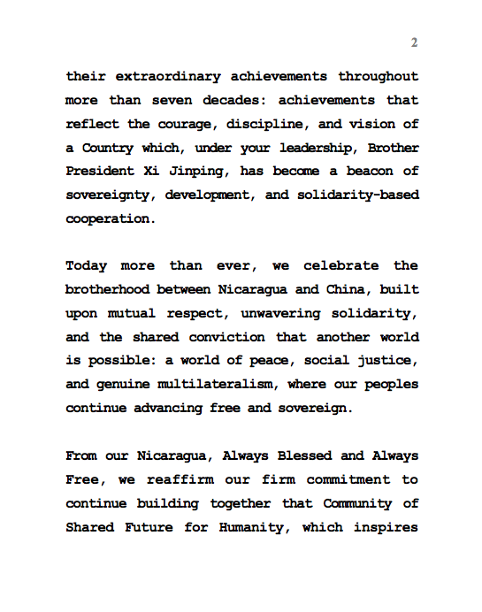 Hoy más que nunca, celebramos la Hermandad entre Nicaragua y China, cimentada en el Respeto mutuo, la Solidaridad inquebrantable y la Convicción compartida de que otro Mundo es posible: un Mundo de Paz, de Justicia Social y de auténtico Multilateralismo, donde nuestros Pueblos sigan avanzando Libres y Soberanos.