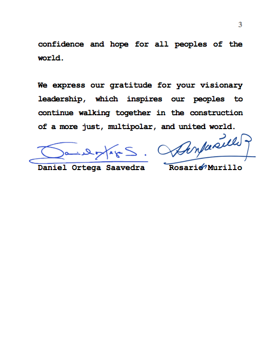 Desde nuestra Nicaragua, Siempre Bendita y Siempre Libre, reafirmamos nuestro firme compromiso de seguir construyendo junt@s esa Comunidad de Futuro Compartido para la Humanidad, que inspira Confianza y Esperanza a todos los Pueblos del Mundo.