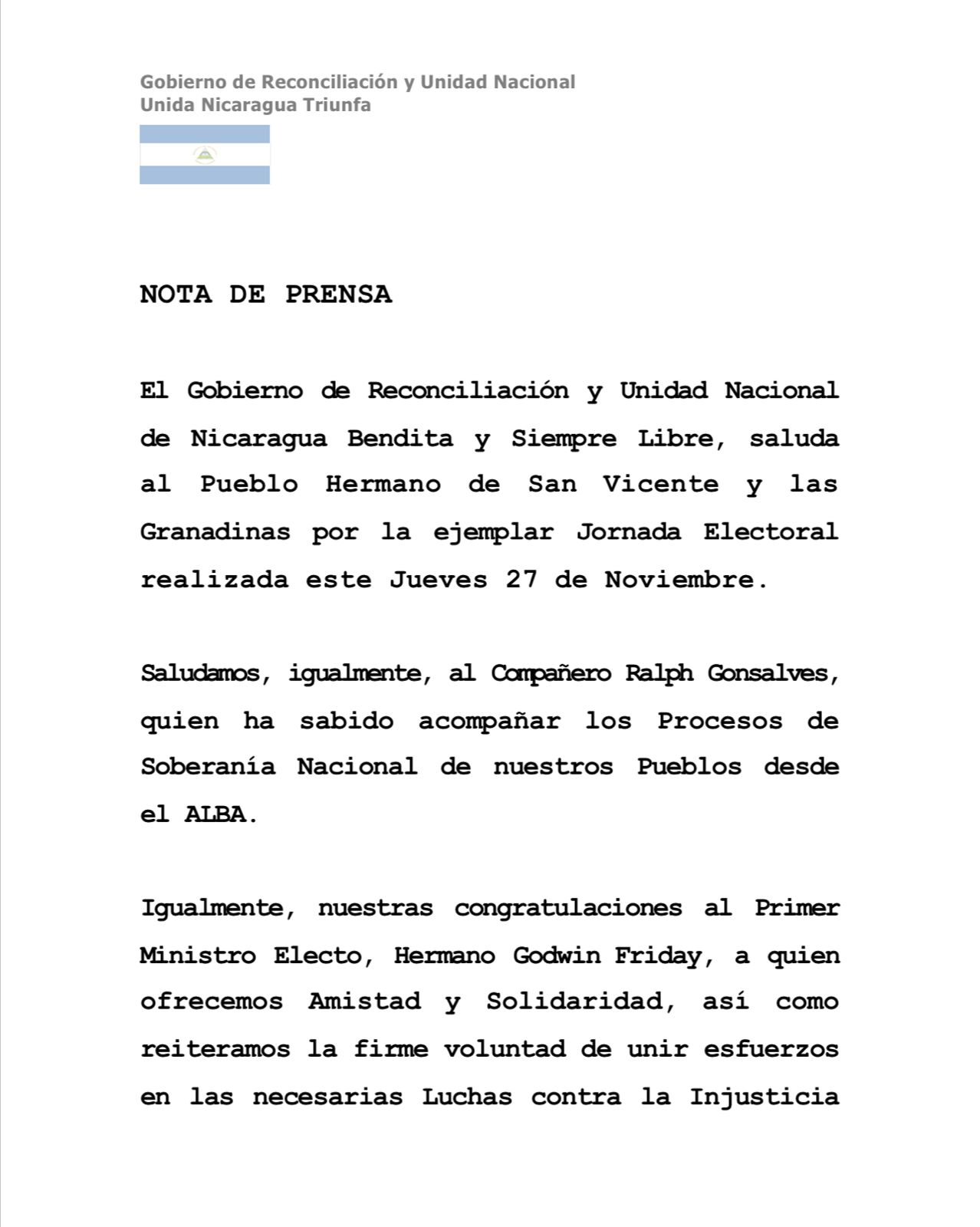 El Gobierno de Reconciliación y Unidad Nacional de Nicaragua Bendita y Siempre Libre, saluda al Pueblo Hermano de San Vicente y las Granadinas por la ejemplar Jornada Electoral realizada este Jueves 27 de Noviembre.