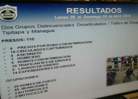 Como resultado del plan de seguridad la Policía Nacional logró desarticular dos agrupaciones delincuenciales, en Managua y en Tipitatapa, que se dedicaban al tráfico de drogas, dejando a 110 personas detenidas.