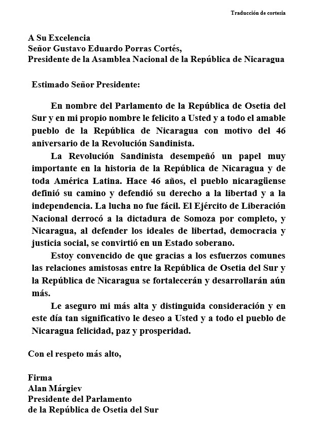 En nombre del Parlamento de la República de Osetia del Sur y en mi propio nombre le felicito a Usted y a todo el amable pueblo de la República de Nicaragua con motivo del 46 aniversario de la Revolución Sandinista.